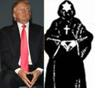 This image of Donald Trump and the drawing of a hooded member of Ancient Germanic Brotherhood of Death displacing the hand gesture of the Satanic “inverted pyramid“ also doesn’t require a great deal of explanation.